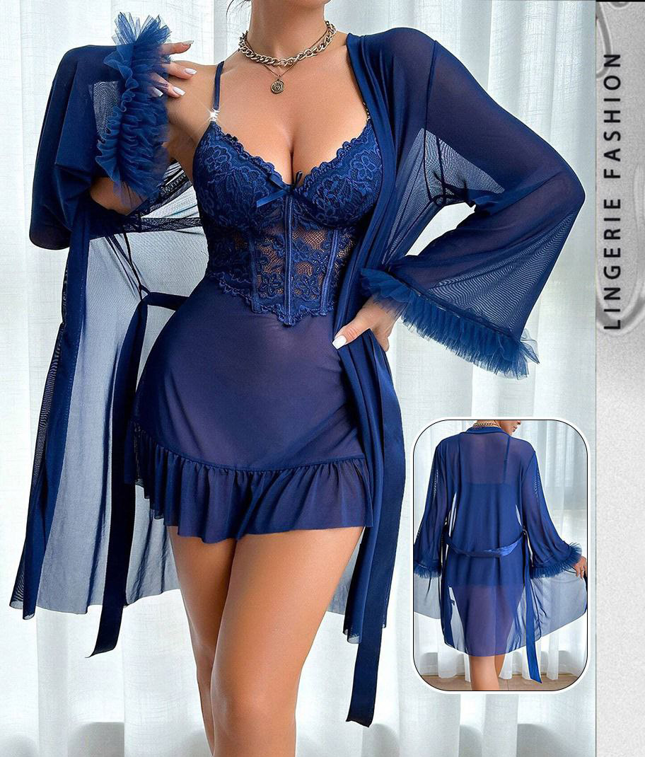 Blue Two-piece lingerie set sheer inner and sheer outer robe