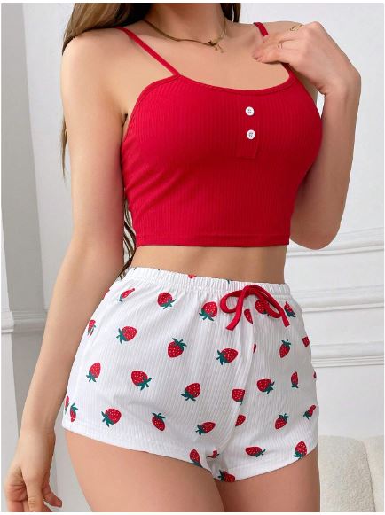 Enjoy comfort and style at home with this lightweight summer loungewear set, featuring a red spaghetti strap top and white shorts adorned with a cute strawberry print. With its simple, attractive design and soft cotton fabric, this set keeps you fresh and comfortable all day. Perfect for summer and cozy home wear. One size fits most (suitable for 50–80 kg).