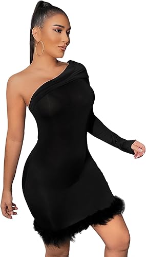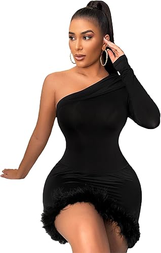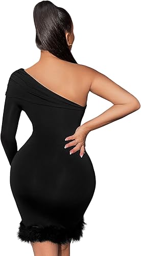 One-shoulder elegant dress. Soft, stretchy fabric for a flattering silhouette. Asymmetric sleeve design. Feather-style hem trim for a luxurious look. One size fits most (suitable for 50–80 kg).