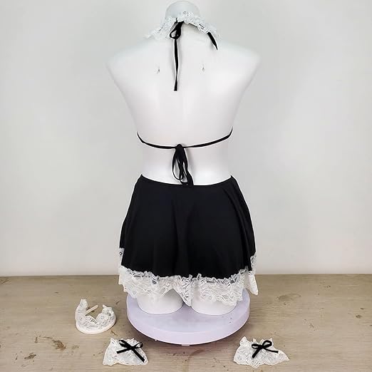 This black two-piece costume lingerie set is designed to add a playful and seductive touch to your nightwear collection. The top features a stylish bow detail and striped accents, enhancing its charming look. The short skirt is designed with a flared cut, creating an alluring and feminine silhouette. Made from high-quality, soft, and stretchy fabric, this set ensures both comfort and confidence. Perfect for special nights and themed occasions, it brings a unique and stylish feel to your wardrobe.