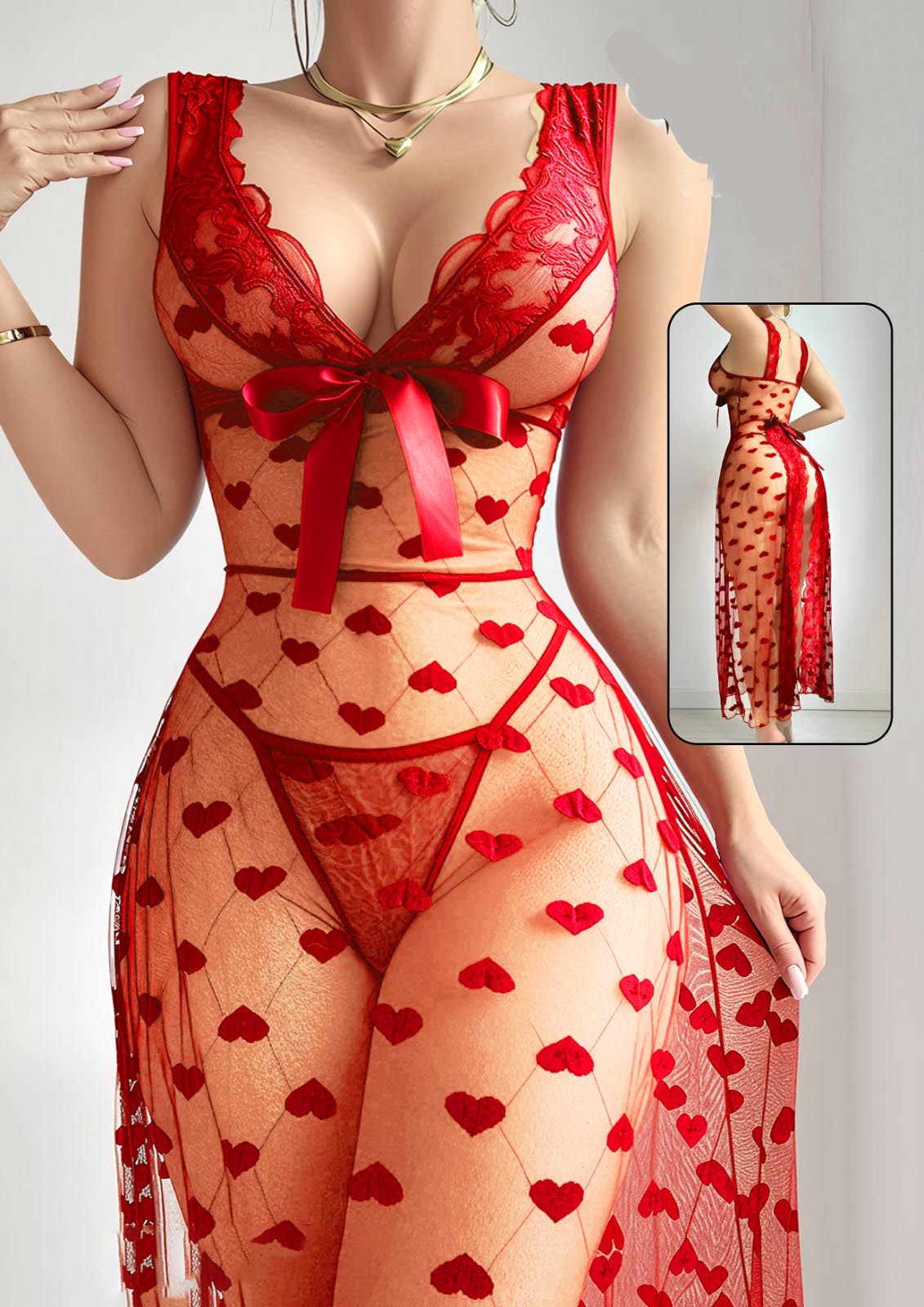 This elegant sheer lingerie set is designed to add a bold and feminine touch to your look. Crafted from soft transparent mesh with romantic heart details, it features a deep V neckline enhanced with delicate lace and a satin bow at the center for a flattering finish. The long sheer skirt adds a seductive flow while maintaining elegance, making it perfect for special moments. One size fits most (suitable for 50–75 kg).