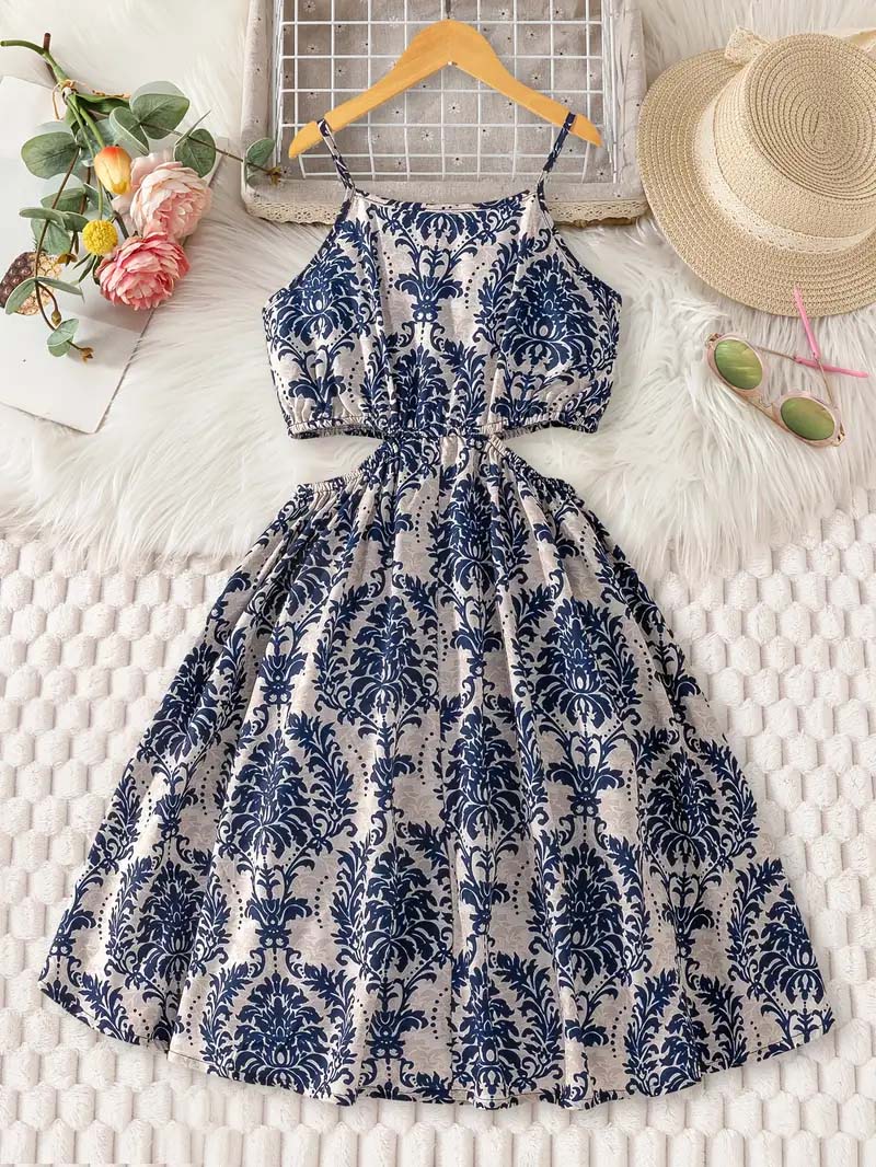 Stay effortlessly stylish with this lightweight mini home dress, featuring an elegant blue patterned print that adds a touch of sophistication. The soft breathable fabric ensures all-day comfort, while the smocked back offers a flexible and flattering fit. The ruffled shoulder straps add a cute feminine detail, making it perfect for home wear, casual days, or summer outings. One size fits most (suitable for 50–75 kg).