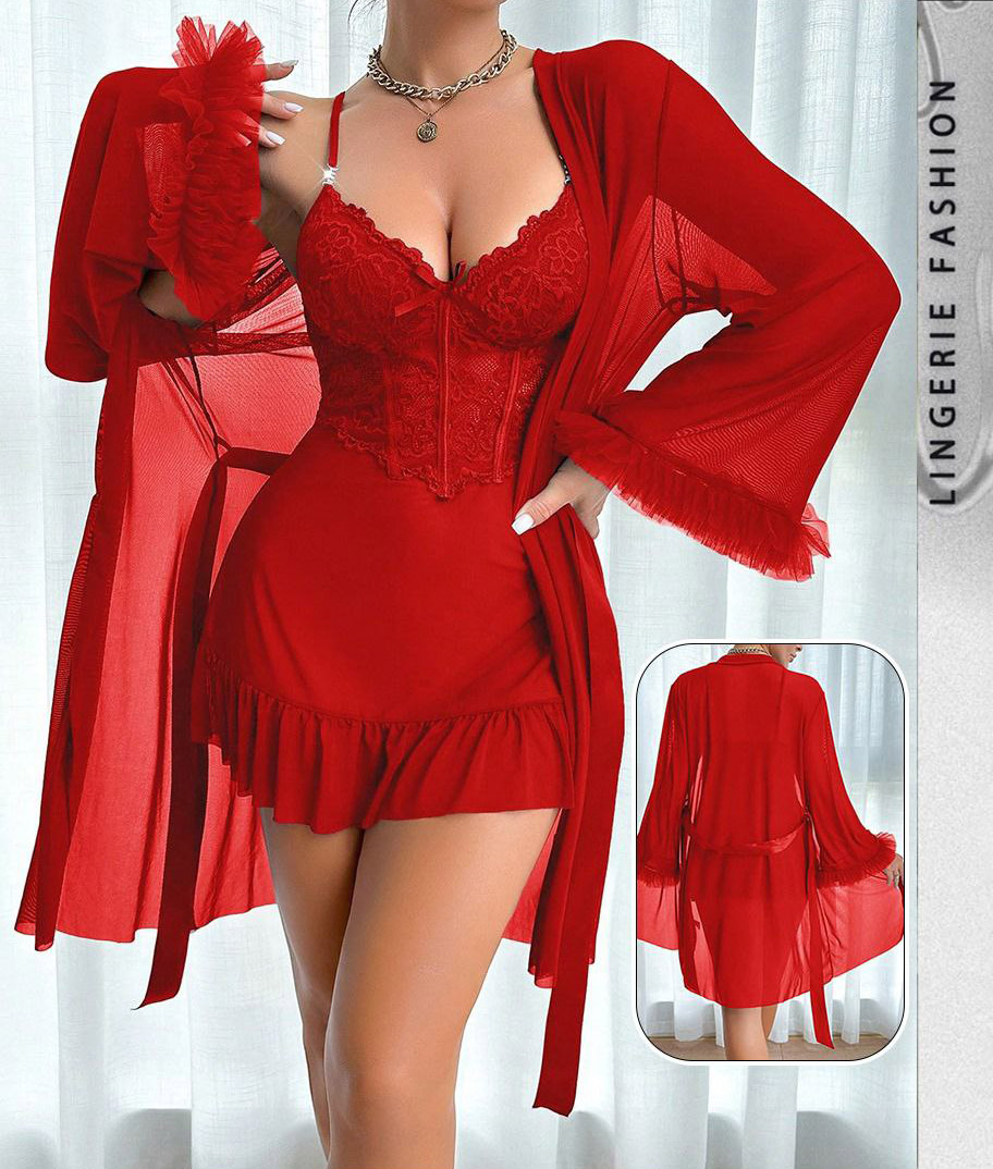 Red Two-piece lingerie set sheer inner and sheer outer robe