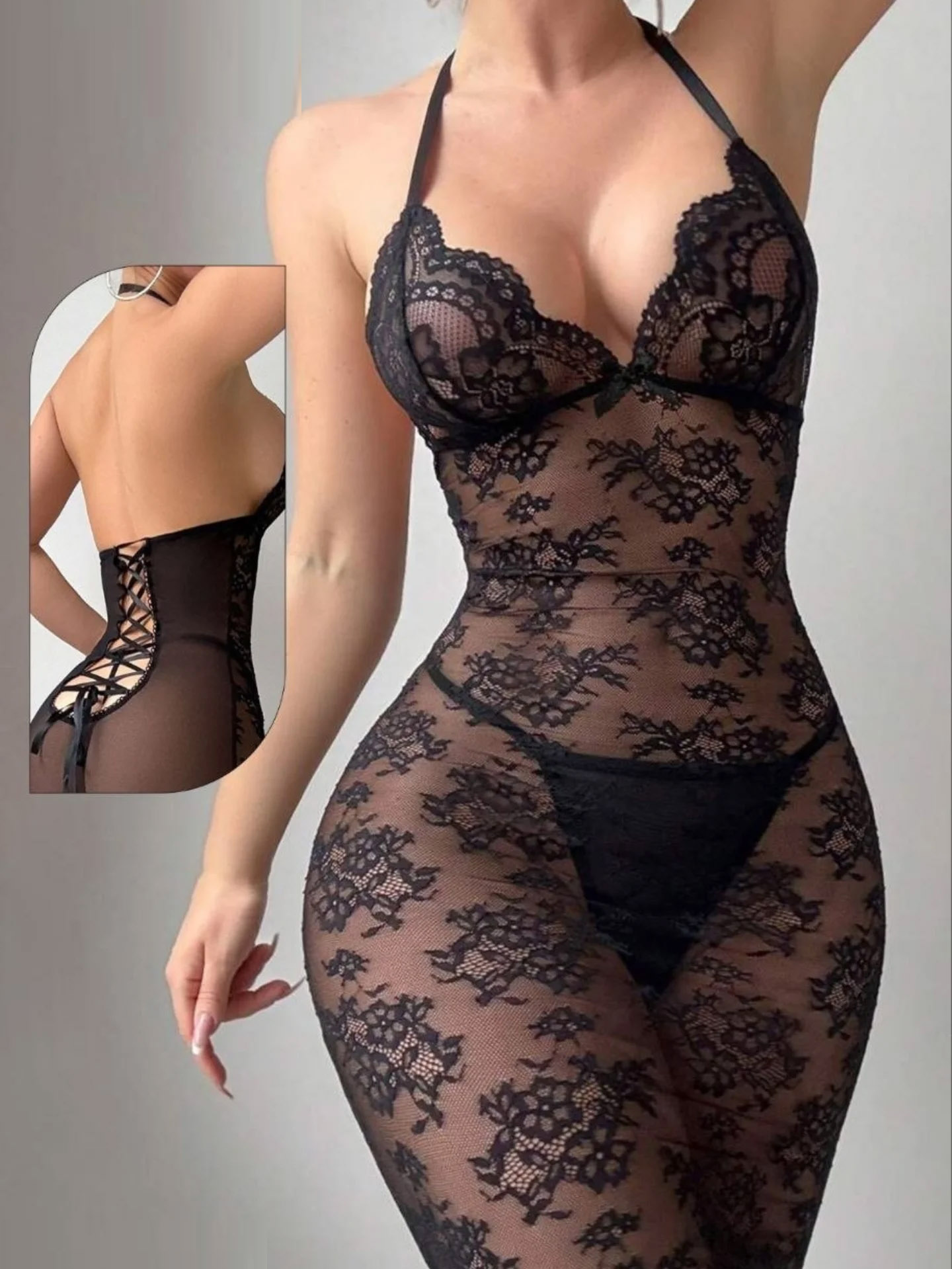 Sheer lace maxi lingerie dress with a slim, body-hugging silhouette that highlights feminine curves for an elegant, seductive look at home. The front features soft lace cups and an all-over floral lace pattern, while the back is designed with a corset-style lace-up detail and a back slit for added allure and easy movement. Halter neck straps provide adjustable support and a secure fit, making this piece perfect for romantic nights, honeymoon outfits, and luxurious bedroom styling. Premium quality product, available in MAW Store.