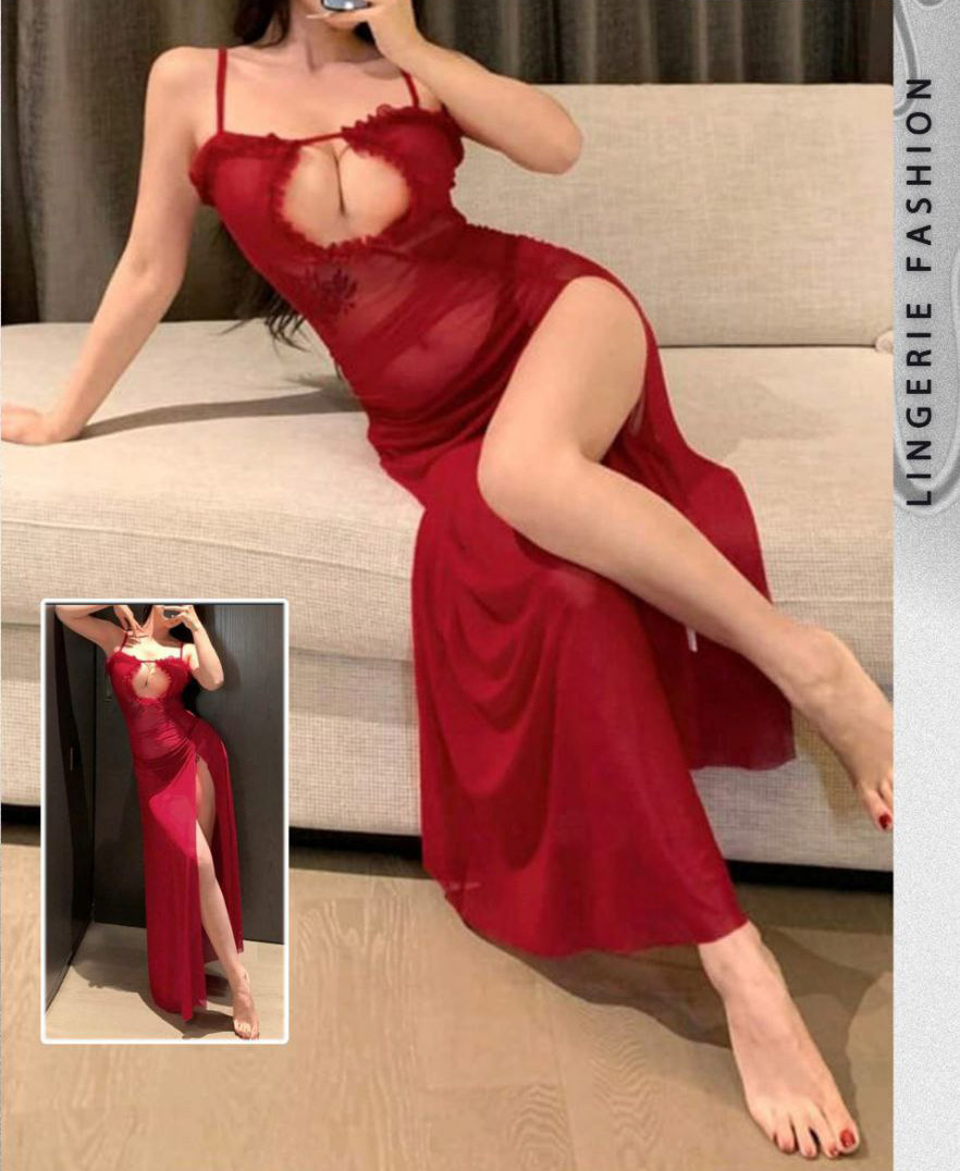 Seductive sheer maxi lingerie dress featuring a daring heart-shaped cut-out bust and soft flowing fabric that drapes elegantly over the body for an ultra-feminine look. Delicate floral lace detailing at the front adds a romantic touch, while the high side slit enhances freedom of movement and highlights the legs for special evenings and romantic nights. Finished with thin adjustable straps for a secure and comfortable fit, making it perfect for honeymoon wear, special occasions at home, and luxurious lounging. Premium quality product, available in MAW Store.