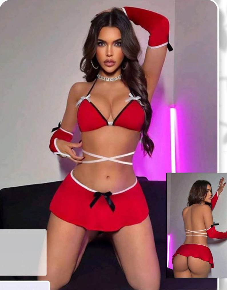This playful school-inspired lingerie set is designed to create a fun, bold, and attractive look. The top features a halter-style design with decorative bows and adjustable straps for a flattering fit. The matching mini skirt comes with a soft flared cut and a ribbon accent, adding movement and charm to the outfit. The set also includes matching arm sleeves to complete the costume style. Made from soft, stretchy fabric that provides comfort and enhances the silhouette. One size fits most (suitable for 50–80 kg).