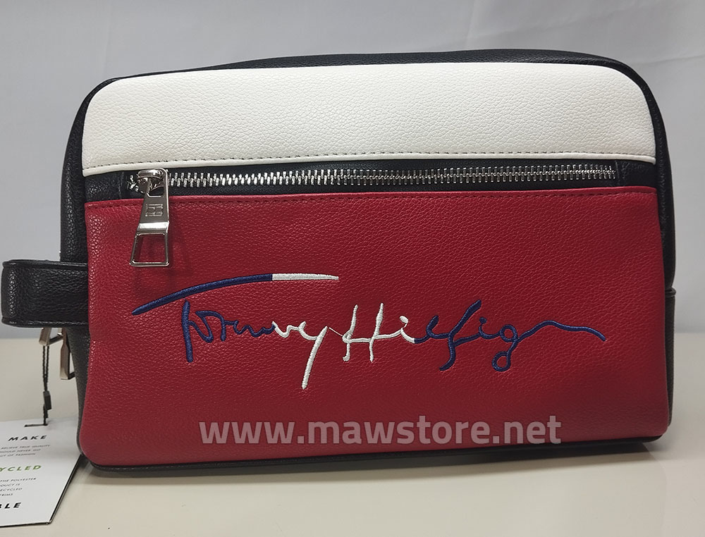 Men’s Tommy Hilfiger hand bag (Mirror) with box, featuring stylish pebbled leather, a bold Tommy signature stripe, and premium finish. Includes a large zippered main compartment, practical front zip pocket, and detachable adjustable shoulder and wrist straps for versatile carrying. Premium quality product, delivered in its branded box, available in MAW Store.