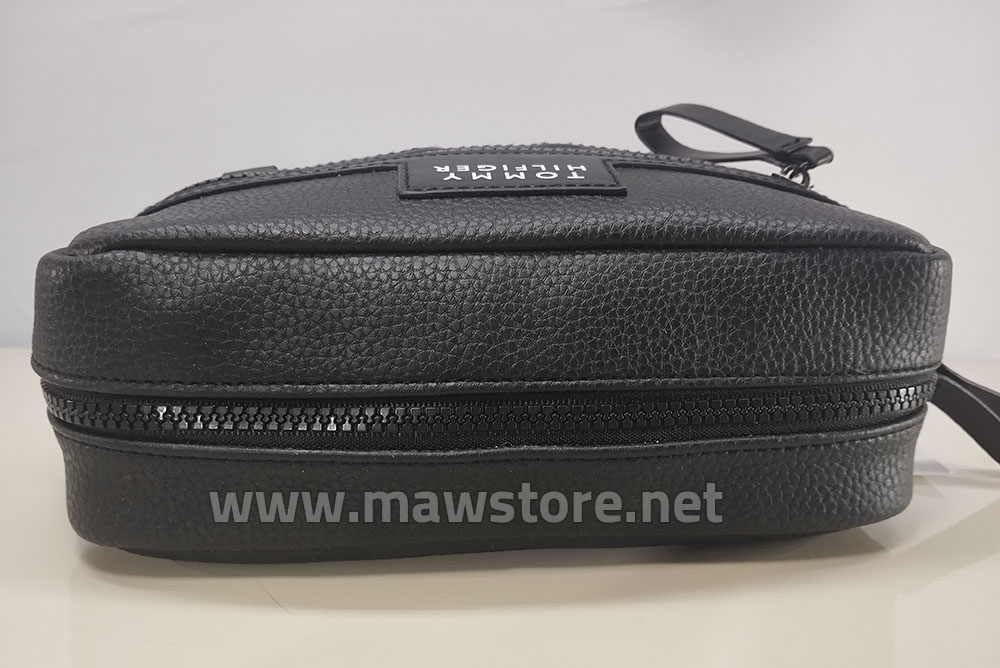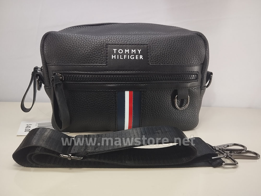 Men’s Tommy Hilfiger hand bag (Mirror) with box, featuring stylish pebbled leather, a bold Tommy signature stripe, and premium finish. Includes a large zippered main compartment, practical front zip pocket, and detachable adjustable shoulder and wrist straps for versatile carrying. Premium quality product, delivered in its branded box, available in MAW Store.