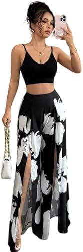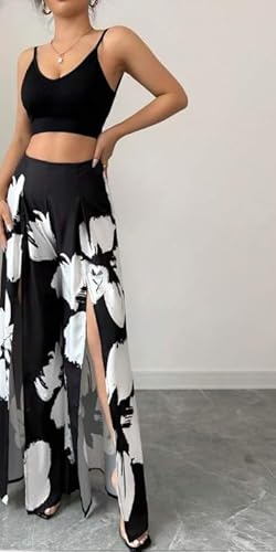 Enjoy a bold and stylish look with this chic two-piece set, featuring a black cropped top paired with a flowy maxi skirt in a modern floral print. The soft, lightweight fabric ensures comfort, while the high-waisted skirt with front slits adds movement and femininity. The matching design creates an elegant, trendy outfit suitable for home wear, outings, or summer occasions. One size fits most (suitable for 50–75 kg).